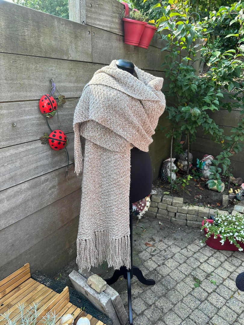 Deze sjaal is gebreid van 50% alpaca en 50% wol.