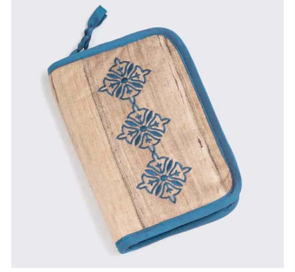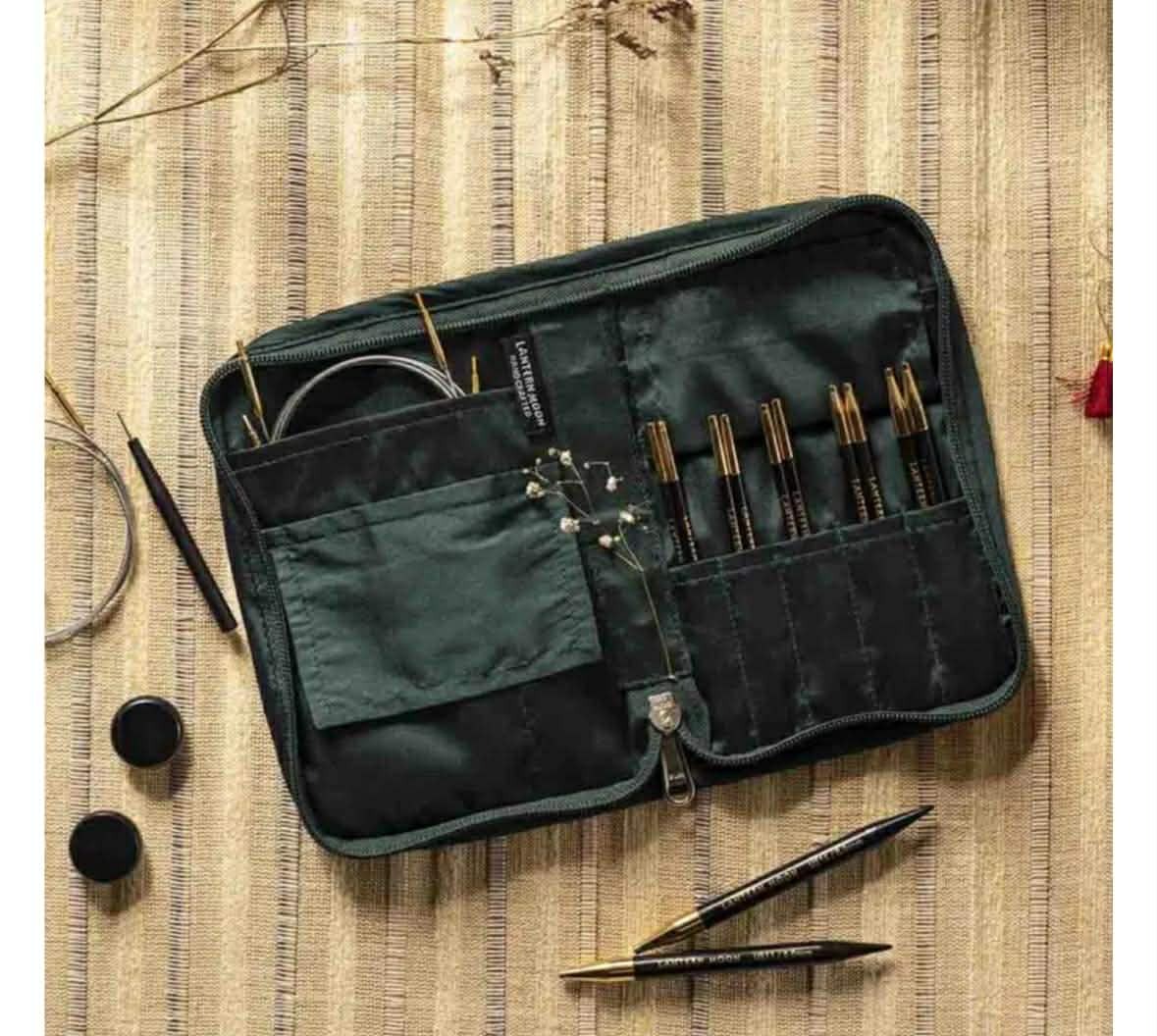 De set is verpakt in een prachtig rechthoekig stoffen etui dat sluit met een rits. De binnenkant heeft een mooie blauwe kleur, de buitenkant is neutraal gekleurd en heeft een blauw borduursel. Het etui heeft aparte vakjes voor het opbergen van de naaldpunten en voldoende andere vakken voor de kabels en accessoires.